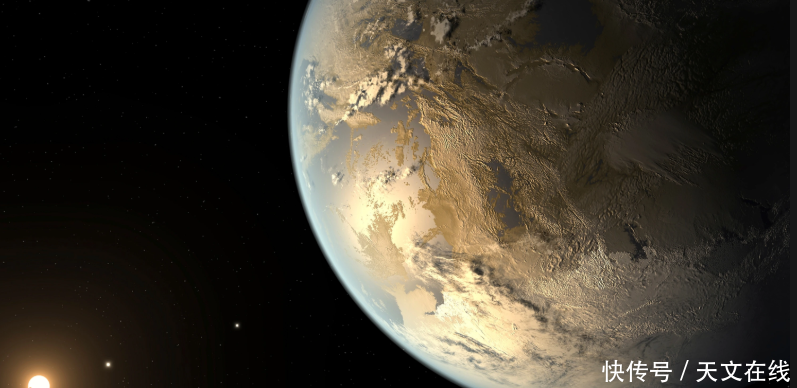 这幅艺术家的插图显示了温带行星罗斯128b,背景是它的红矮星母星。这颗行星和恒星距离地球仅有11光年。